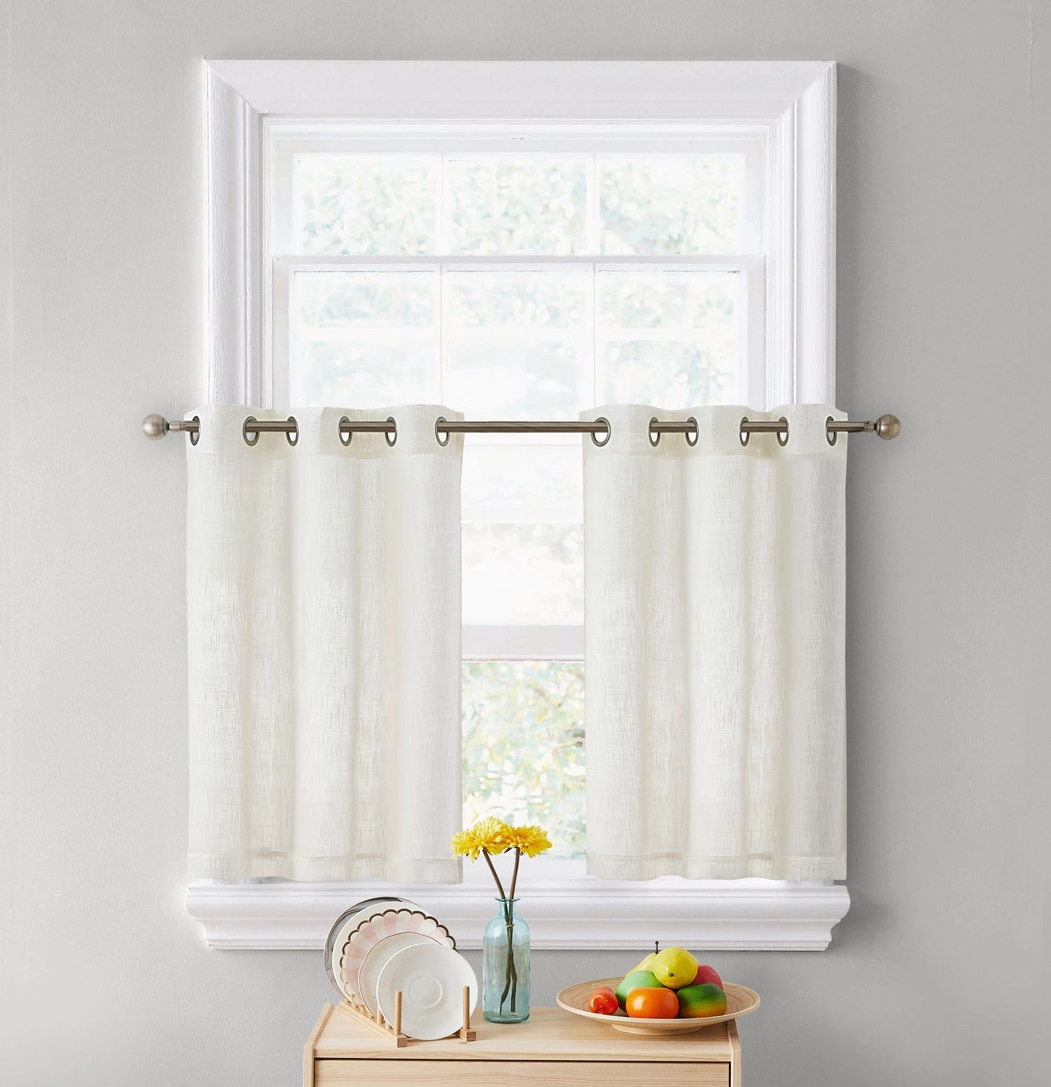 Heavy Faux Linen Textured Semi Sheer Curtain Grommet Tier Panels will liven up your indoor kitchen, bathroom, and basement spaces with a sense of airiness and beauty. Made from solid color polyester voile. Bring elegance and class to any room with this light filtering semi sheer curtains. Our luxurious sheer grommet cafe tier panels gives your home a new elegant look. Allows natural light to flow through the room. Available in lengths of 24″, 36″, and 45″ inch. For a full look use two (2) panels to cover a standard size window. This picture shows two (2) sheer grommet panels and this package contains two (2) Sheer Grommet Panels.