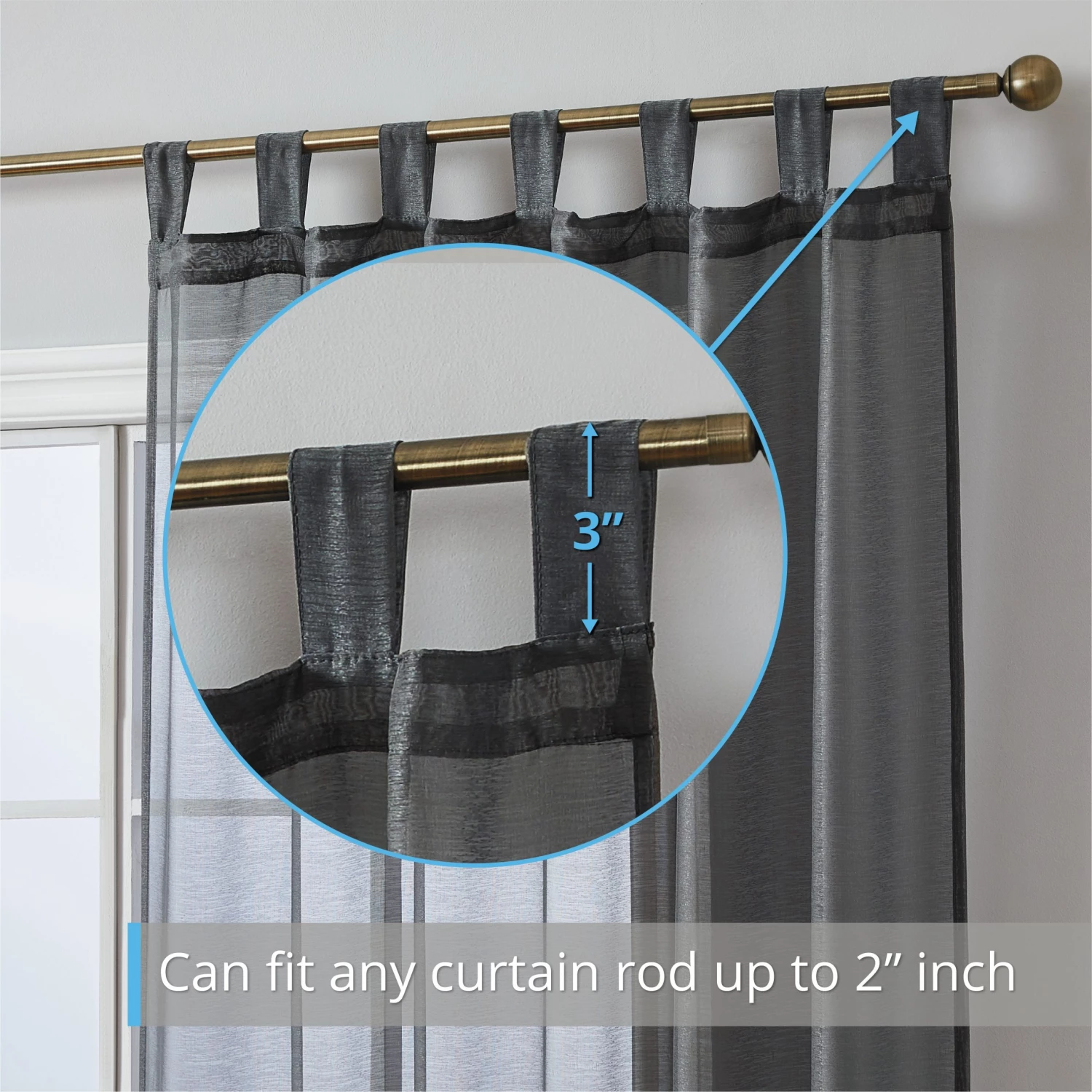 Tab Top semi sheer curtains give a light, romantic and airy look to a room by allowing sunlight to pass through the curtains. The fabric of sheer curtains makes a unique window treatment that allows you to see outside but still allowing for privacy. For most home owners this is a great feature of semi sheer curtains. Light weight sheer curtains are a very effective decorating tool. Because of the lightness to the fabric allow light to enter the room while still providing privacy. They can be used for in many other ways as well. One of the great qualities to semi sheer curtains is that they come in a wide variety of colors and are generally inexpensive. This allows your to use them in every room of the house without breaking your budget. Semi sheer curtains are very easy to install and make them a great addition to any room as you can create a designer look with little effort. Each curtain panel can fit a curtain rod up to 1. 5 inch. Fiber Content: 100% Polyester. Package contains two (2) semi sheer window curtain panels. Care Instructions: Machine wash cold, Gentle Cycle. Use only non-chlorine. Bleach as needed. Tumble Dry Low. Iron on lowest setting as needed.