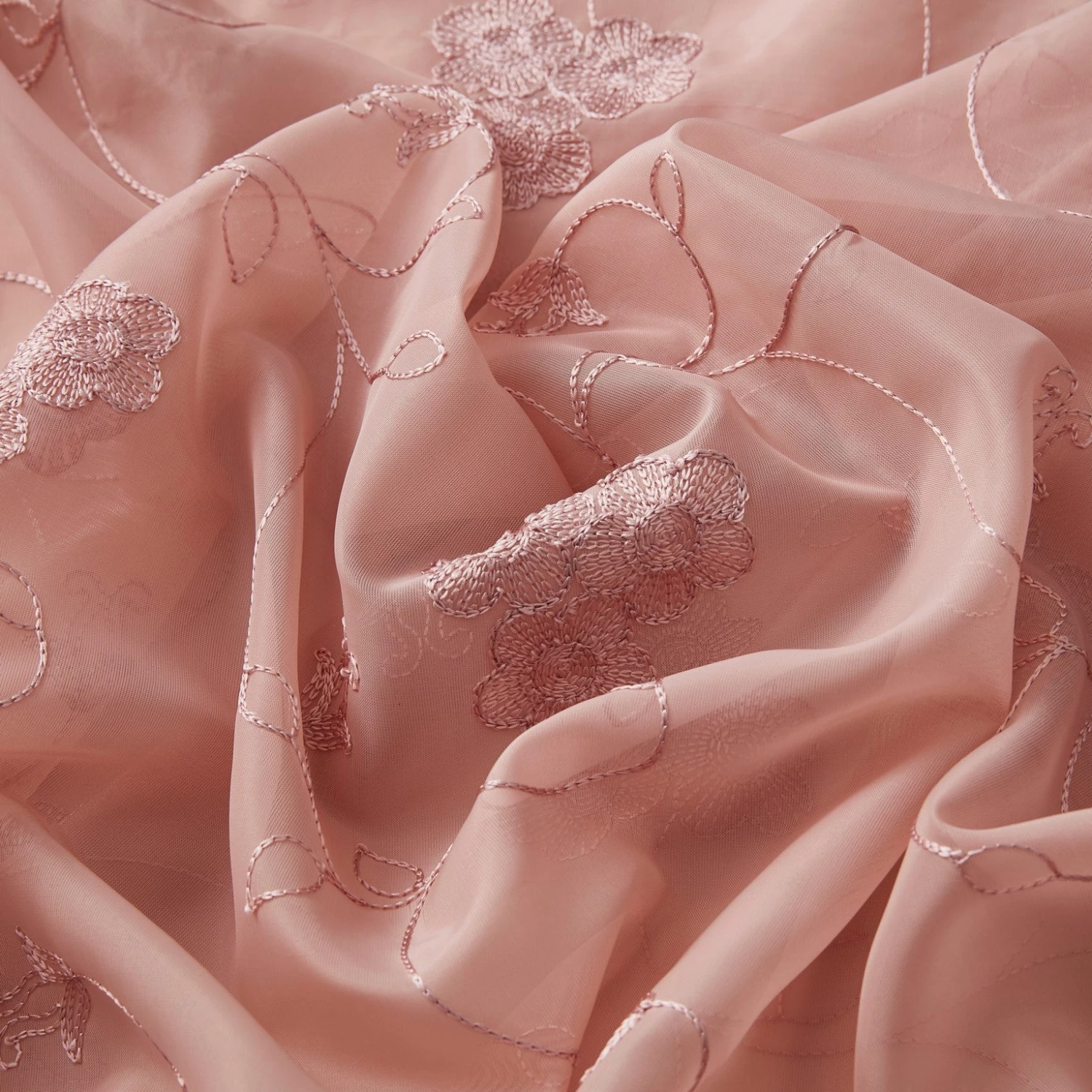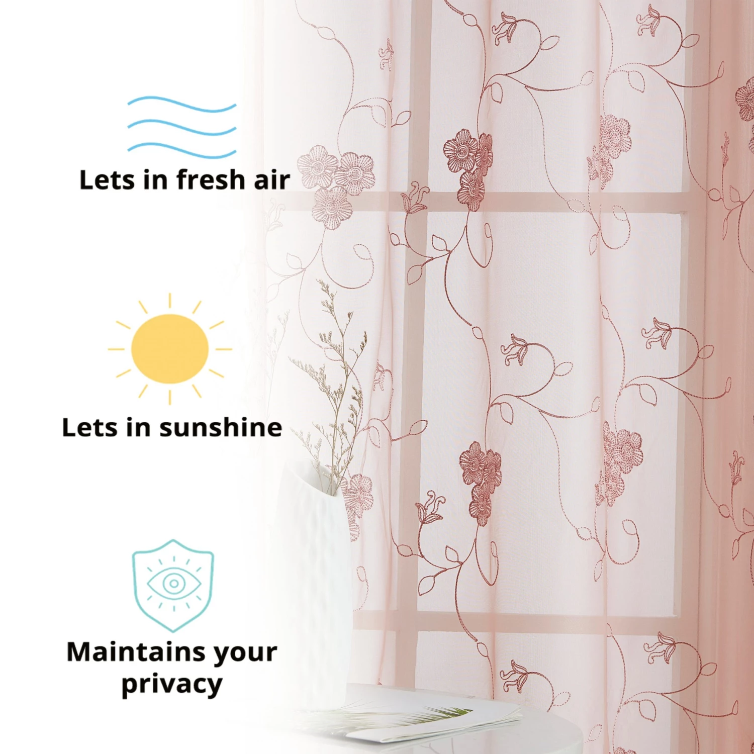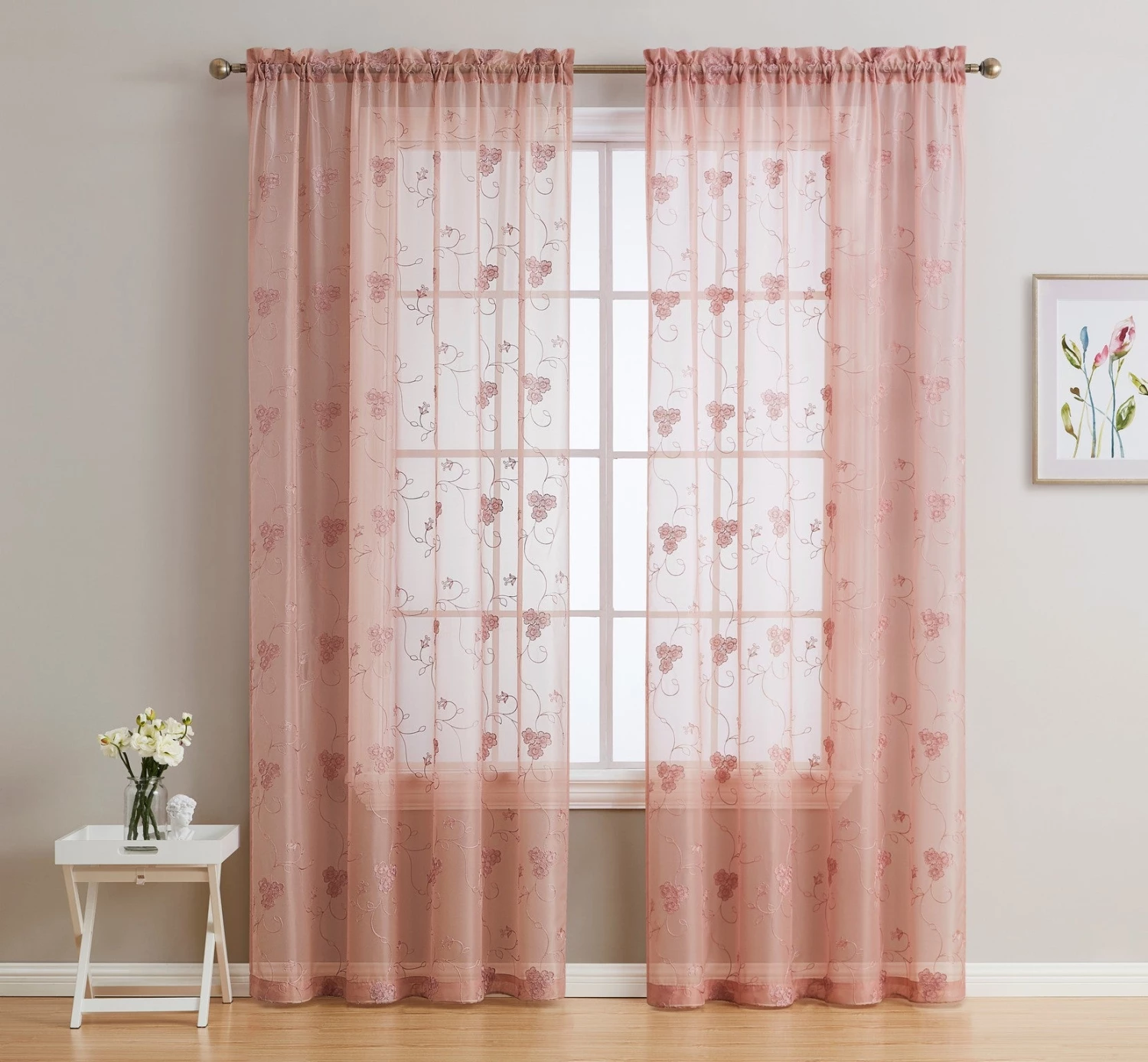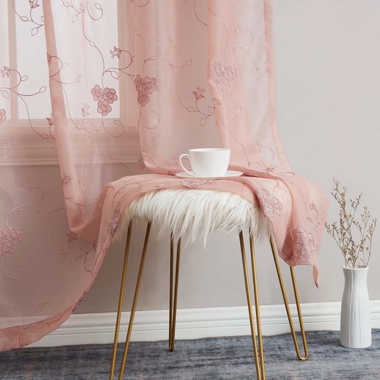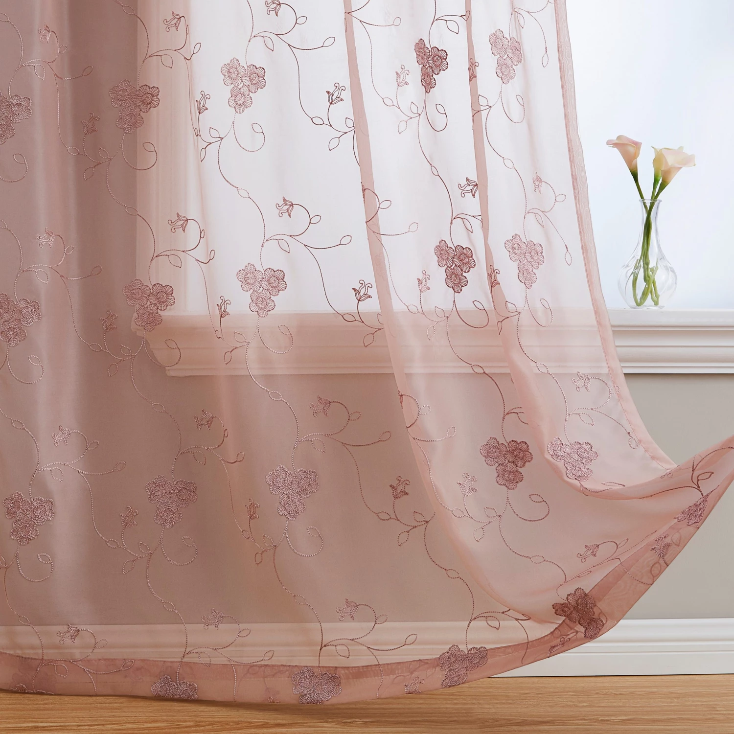 HLC.ME Allegra Floral Embroidered Sheer Curtain Panels – Blush Pink – Set Of 2