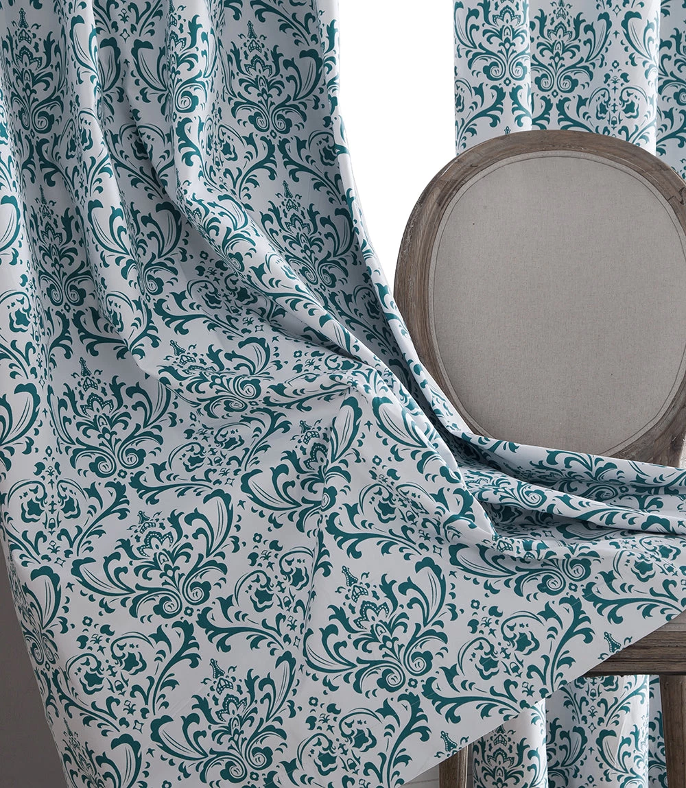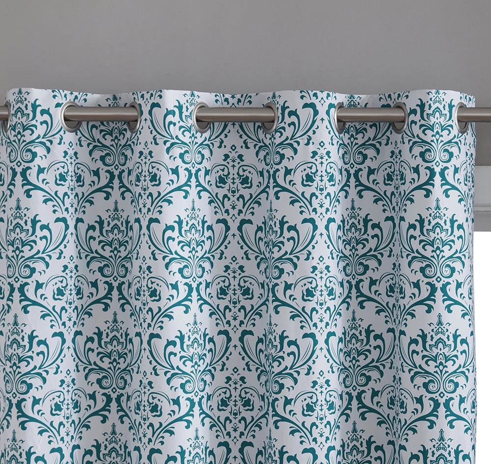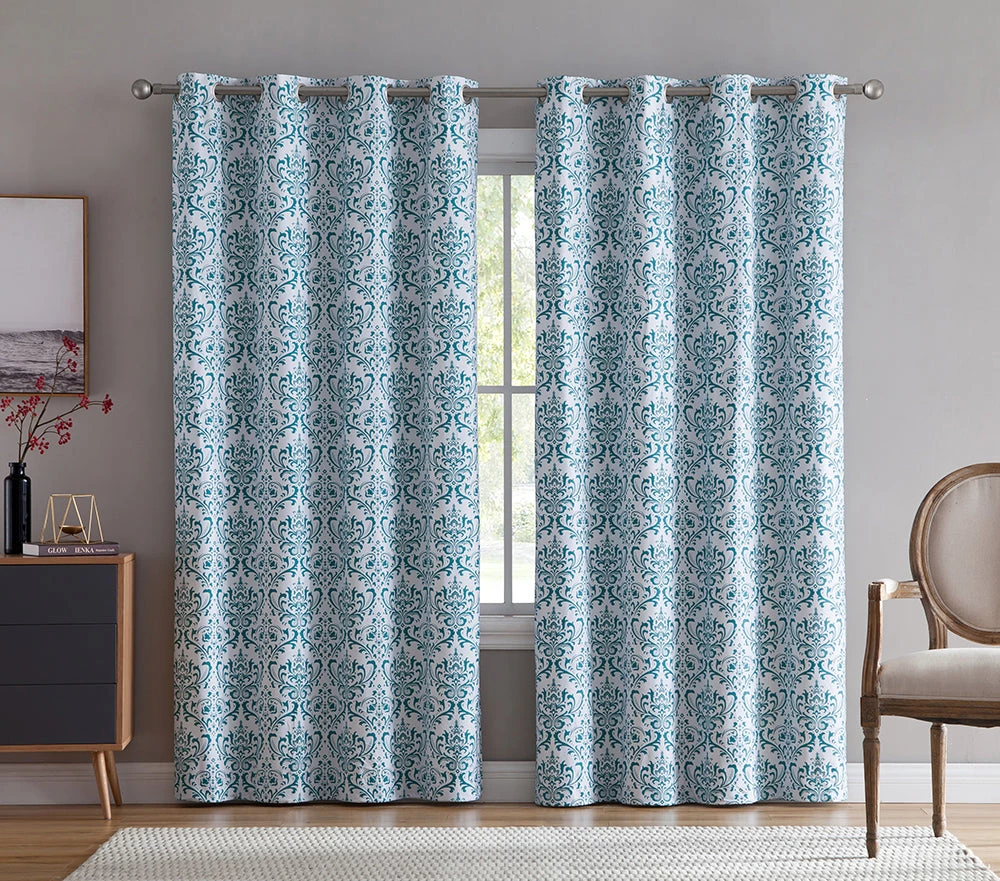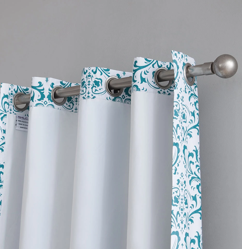 HLC.ME Blackout Curtains Damask Print 100% Blackout Grommet Curtain Panels – Platinum White & Teal Blue – Set Of 2