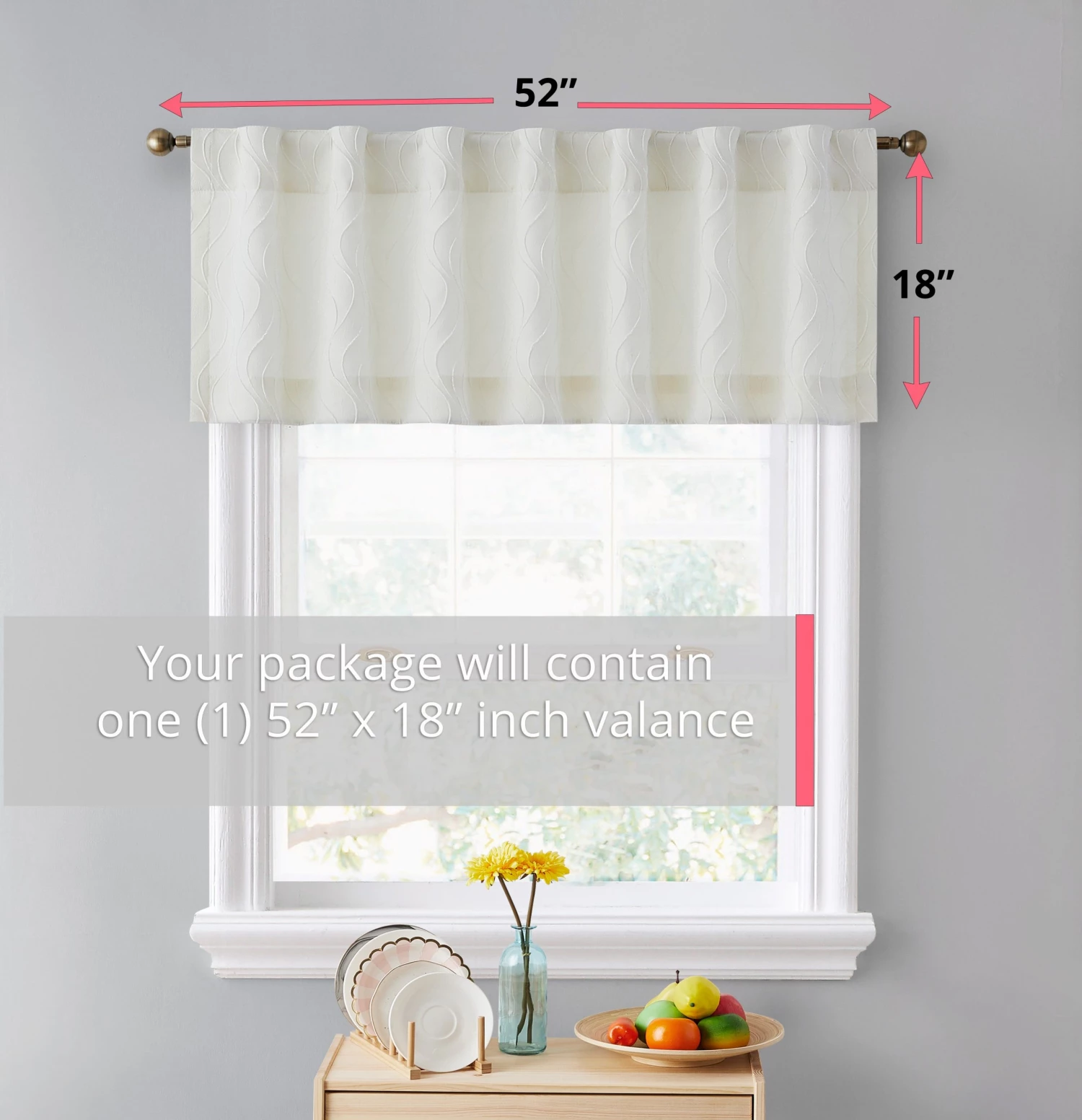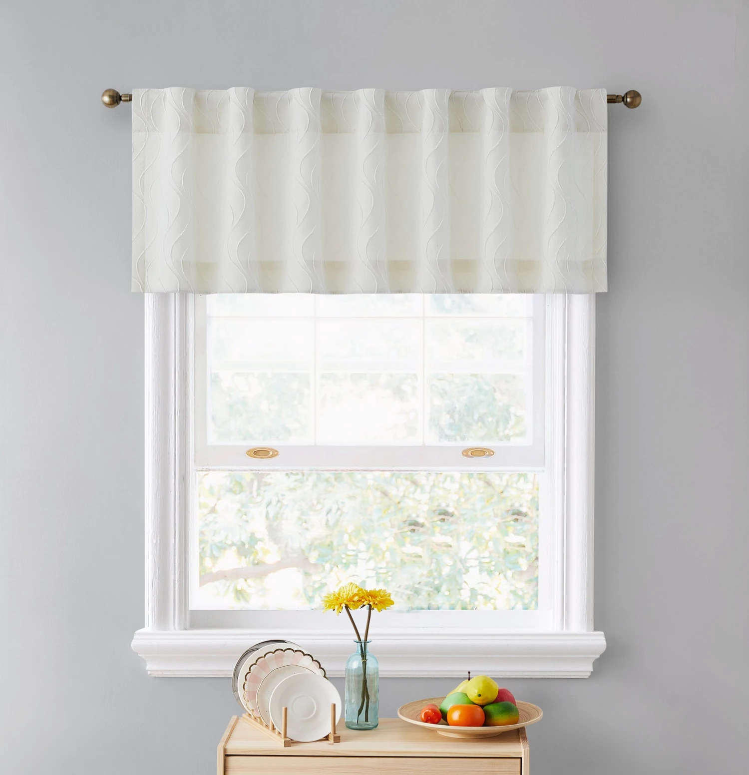 Window Treatment Kitchen Valances give a romantic and airy look to a room by allowing sunlight to pass through the curtains. The fabric of our Camden valances make for a unique window treatment that allows you to see outside but still allowing for privacy. For most home owners this is a great feature of jacquard double layer microfiber valance. They can be used for in many other ways as well such as layering over drapes or using them for those small bay windows in your basement. Package contains one (1) valance. 100% Polyester