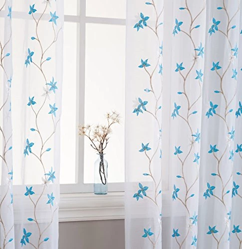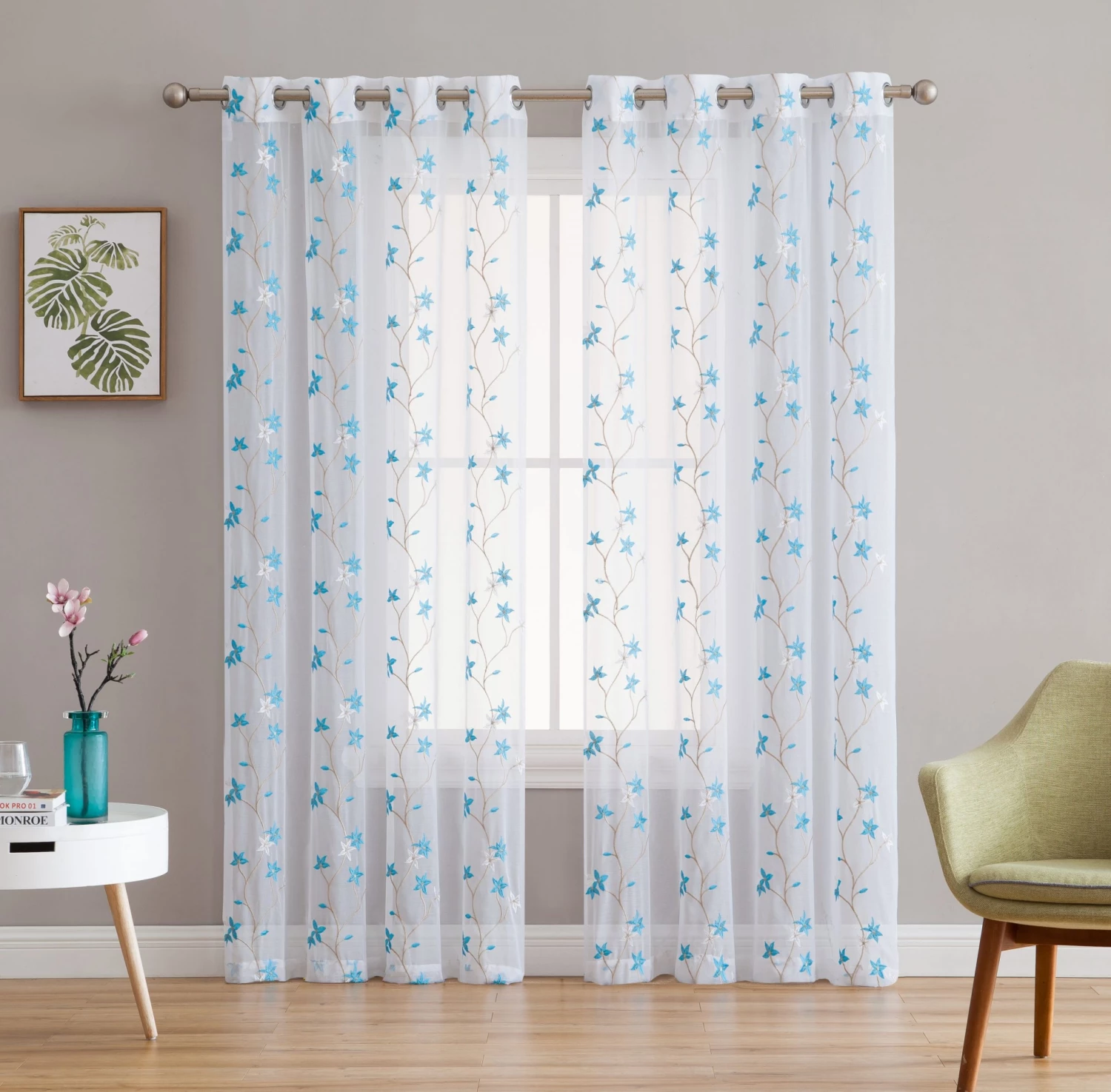 HLC.ME Emma Floral Sheer Grommet Curtain Panels – Turquoise – Set Of 2