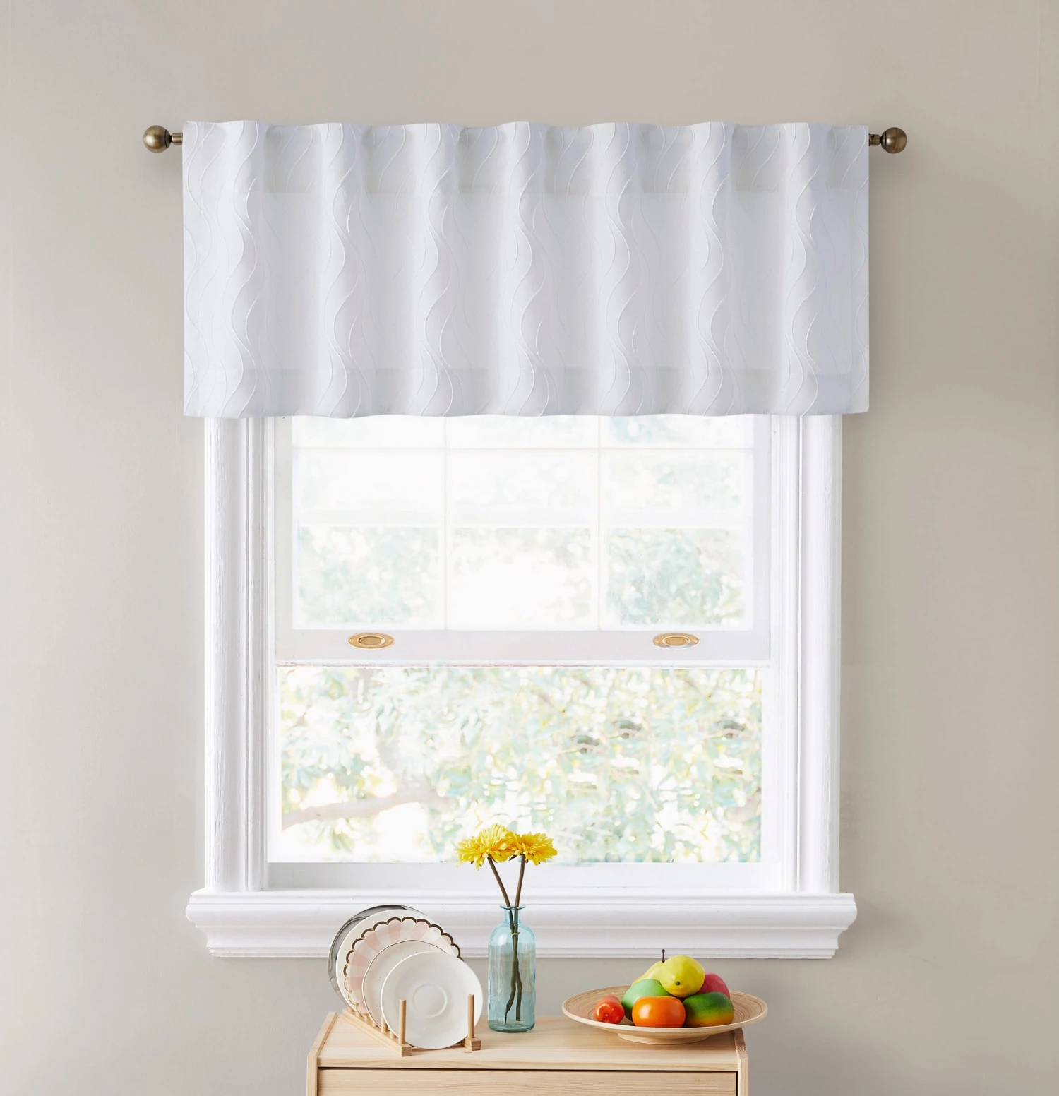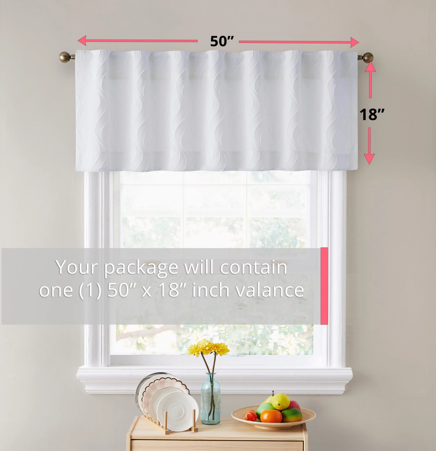 Window Treatment Kitchen Valances give a romantic and airy look to a room by allowing sunlight to pass through the curtains. The fabric of our Camden valances make for a unique window treatment that allows you to see outside but still allowing for privacy. For most home owners this is a great feature of jacquard double layer microfiber valance. They can be used for in many other ways as well such as layering over drapes or using them for those small bay windows in your basement. Package contains one (1) valance. 100% Polyester