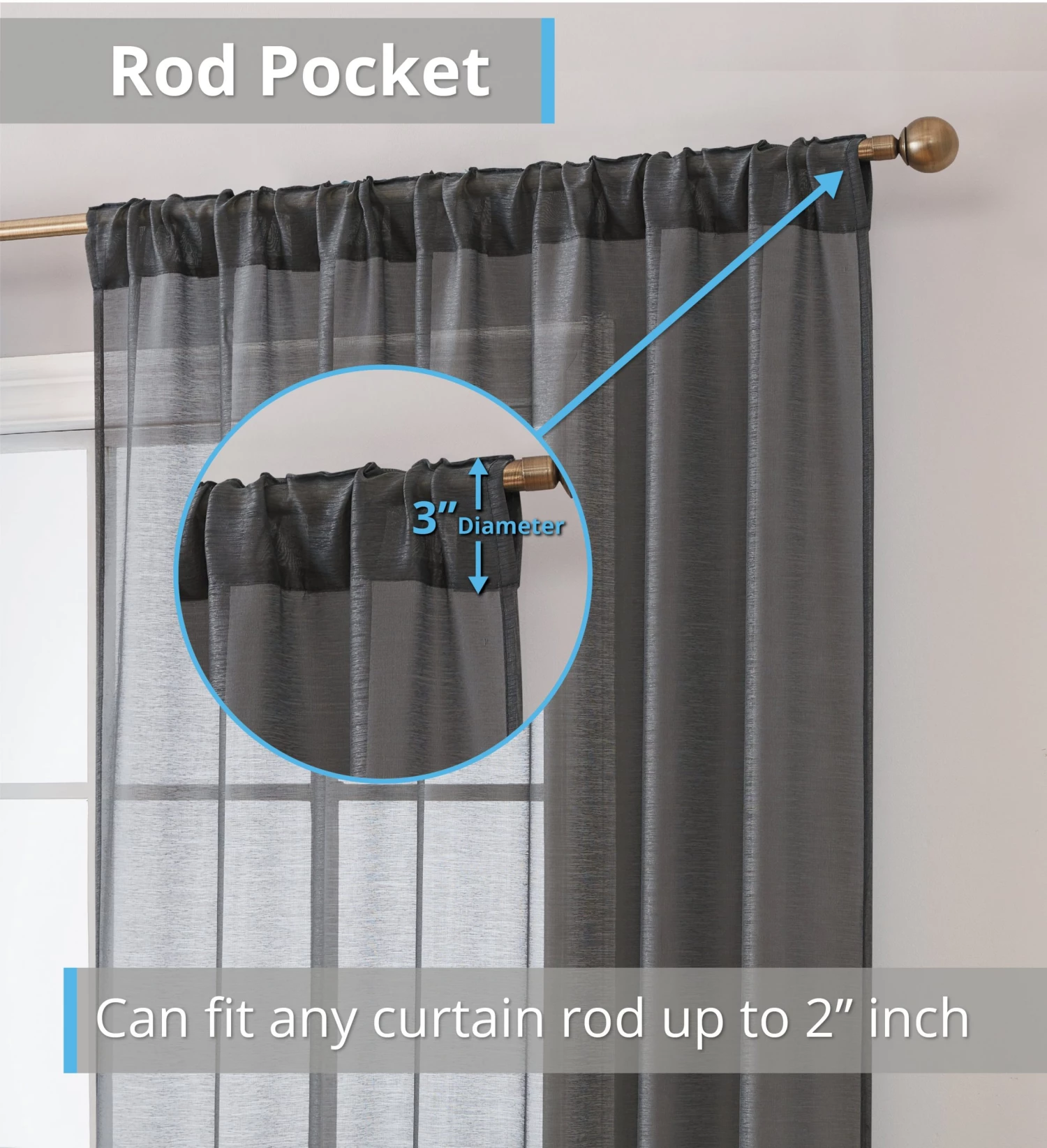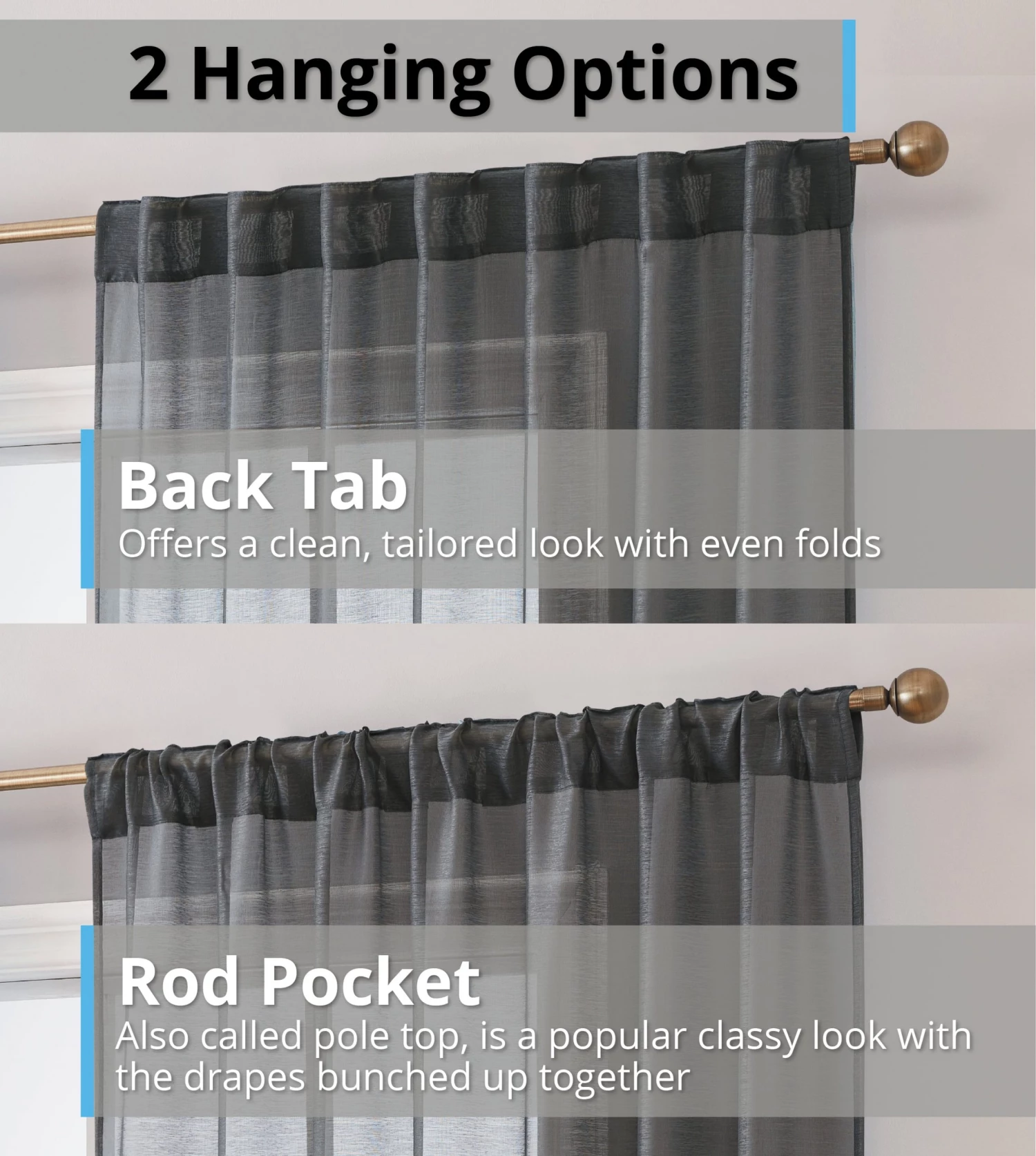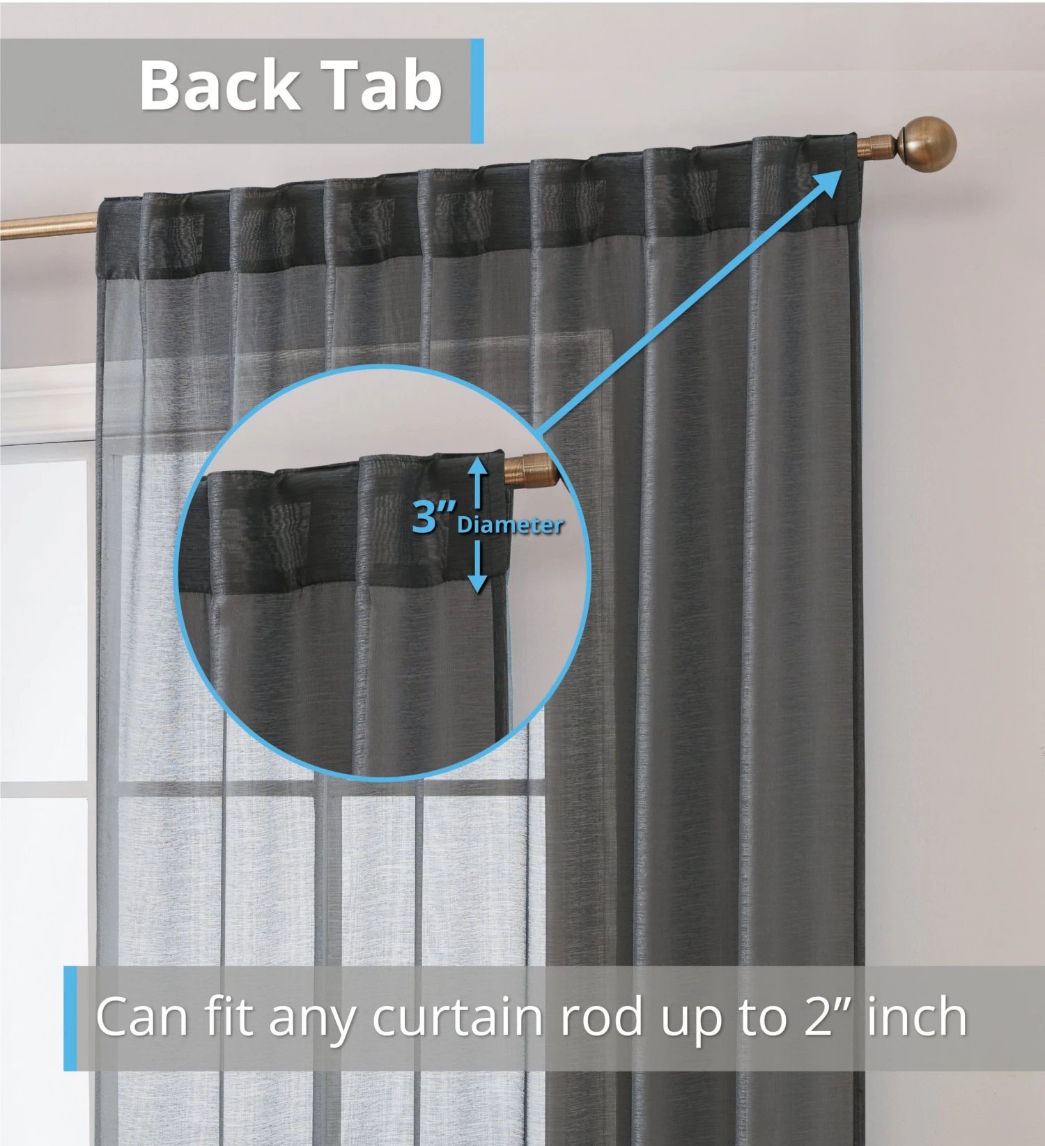 Back Tab Rod Pocket semi sheer curtains give a light, romantic and airy look to a room by allowing sunlight to pass through the curtains. The fabric of sheer curtains makes a unique window treatment that allows you to see outside but still allowing for privacy. For most home owners this is a great feature of semi sheer curtains. Light weight sheer curtains are a very effective decorating tool. Because of the lightness to the fabric allow light to enter the room while still providing privacy. They can be used for in many other ways as well. One of the great qualities to semi sheer curtains is that they come in a wide variety of colors and are generally inexpensive. This allows your to use them in every room of the house without breaking your budget. Semi sheer curtains are very easy to install and make them a great addition to any room as you can create a designer look with little effort. Each curtain panel can fit a curtain rod up to 1. 5 inch. Fiber Content: 100% Polyester. Package contains two (2) semi sheer window curtain panels. Care Instructions: Machine wash cold, Gentle Cycle. Use only non-chlorine. Bleach as needed. Tumble Dry Low. Iron on lowest setting as needed.