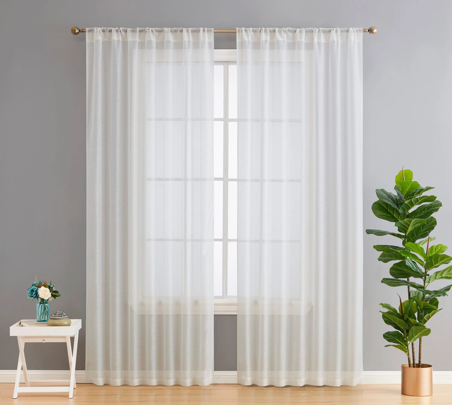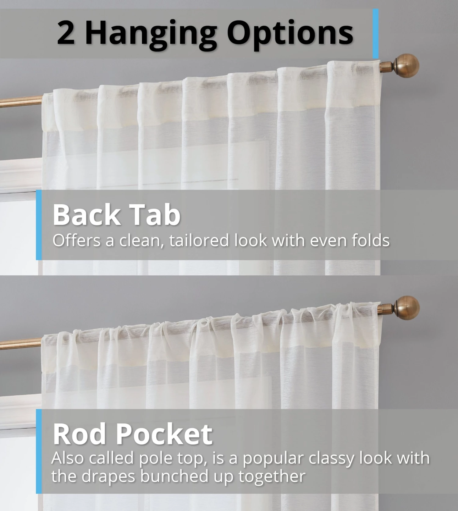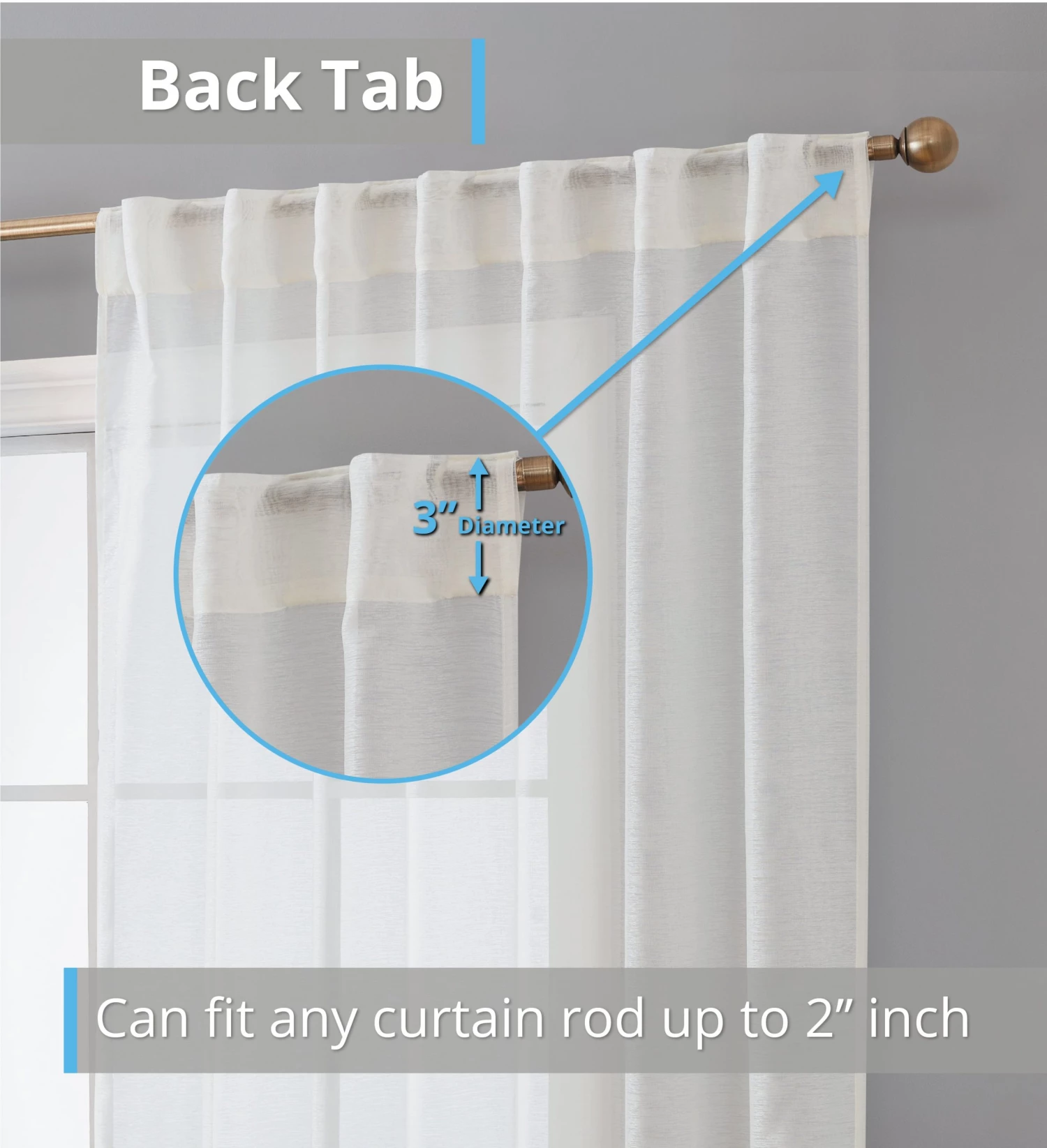 Back Tab Rod Pocket semi sheer curtains give a light, romantic and airy look to a room by allowing sunlight to pass through the curtains. The fabric of sheer curtains makes a unique window treatment that allows you to see outside but still allowing for privacy. For most home owners this is a great feature of semi sheer curtains. Light weight sheer curtains are a very effective decorating tool. Because of the lightness to the fabric allow light to enter the room while still providing privacy. They can be used for in many other ways as well. One of the great qualities to semi sheer curtains is that they come in a wide variety of colors and are generally inexpensive. This allows your to use them in every room of the house without breaking your budget. Semi sheer curtains are very easy to install and make them a great addition to any room as you can create a designer look with little effort. Each curtain panel can fit a curtain rod up to 1. 5 inch. Fiber Content: 100% Polyester. Package contains two (2) semi sheer window curtain panels. Care Instructions: Machine wash cold, Gentle Cycle. Use only non-chlorine. Bleach as needed. Tumble Dry Low. Iron on lowest setting as needed.