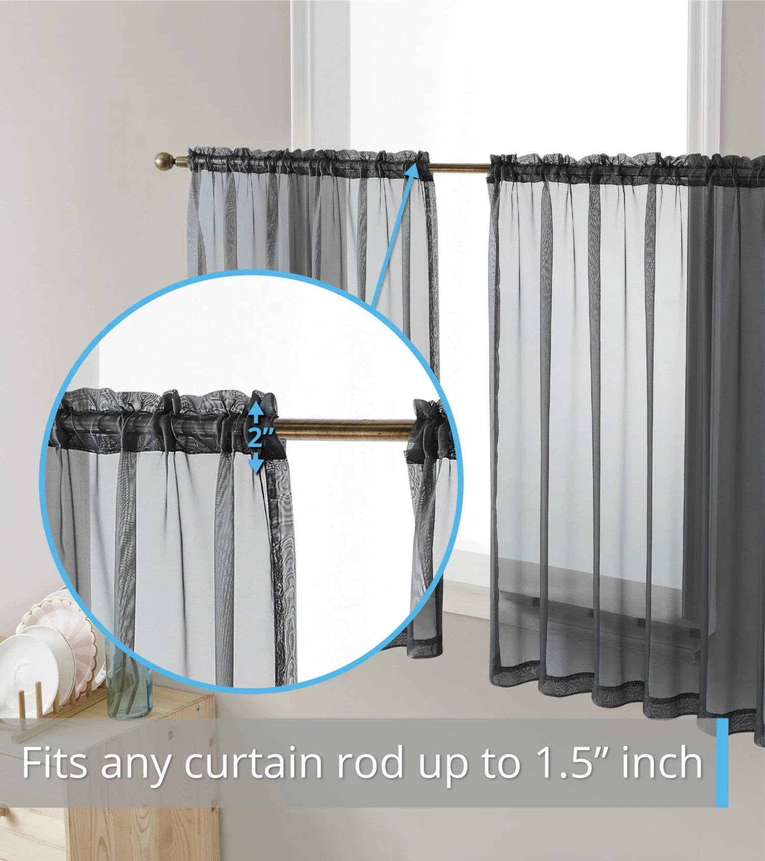 Sheer voile curtains give a light, romantic and airy look to a room by allowing sunlight to pass through the curtains. The fabric of voile curtains makes a unique window treatment that allows you to see outside but still allowing for privacy. For most home owners this is a great feature of sheer voile grommet curtains. Light weight sheer voile curtains are a very effective decorating tool. Because of the lightness to the fabric allow light to enter the room while still providing privacy. They can be used for in many other ways as well. One of the great qualities to sheer voile curtains is they they come in a wide variety of colors and are generally inexpensive. This allows your to use them in every room of the house without breaking your budget. Sheer curtains are very easy to install and make them a great addition to any room as you can create a designer look with little effort. Each curtain panel can fit a curtain rod up to 1. 5 inch. Fiber Content: 100% Polyester. Package contains two (2) voile sheer window curtain panels. Care Instructions: Machine wash cold, Gentle Cycle. Use only non-chlorine. Bleach as needed. Tumble Dry Low. Iron on lowest setting as needed.