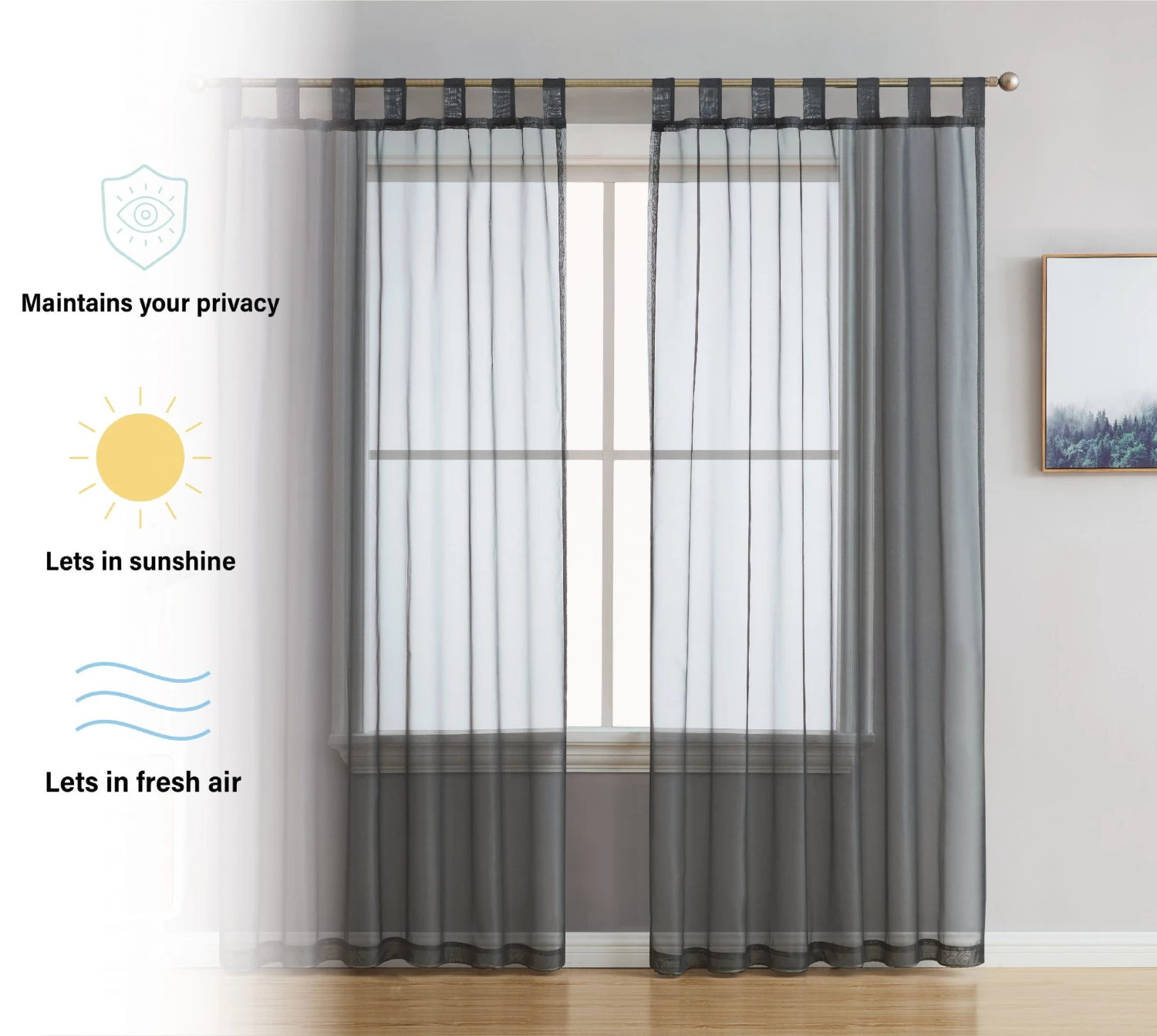 Tab-Top Sheer voile curtains give a light, romantic and airy look to a room by allowing sunlight to pass through the curtains. The fabric of voile curtains makes a unique window treatment that allows you to see outside but still allowing for privacy. For most home owners this is a great feature of sheer voile grommet curtains. Light weight sheer voile curtains are a very effective decorating tool. Because of the lightness to the fabric allow light to enter the room while still providing privacy. They can be used for in many other ways as well. One of the great qualities to sheer voile curtains is they they come in a wide variety of colors and are generally inexpensive. This allows your to use them in every room of the house without breaking your budget. Sheer curtains are very easy to install and make them a great addition to any room as you can create a designer look with little effort. Each curtain panel can fit a curtain rod up to 1. 5 inch. Fiber Content: 100% Polyester. Package contains two (2) voile sheer window curtain panels. Care Instructions: Machine wash cold, Gentle Cycle. Use only non-chlorine. Bleach as needed. Tumble Dry Low. Iron on lowest setting as needed.