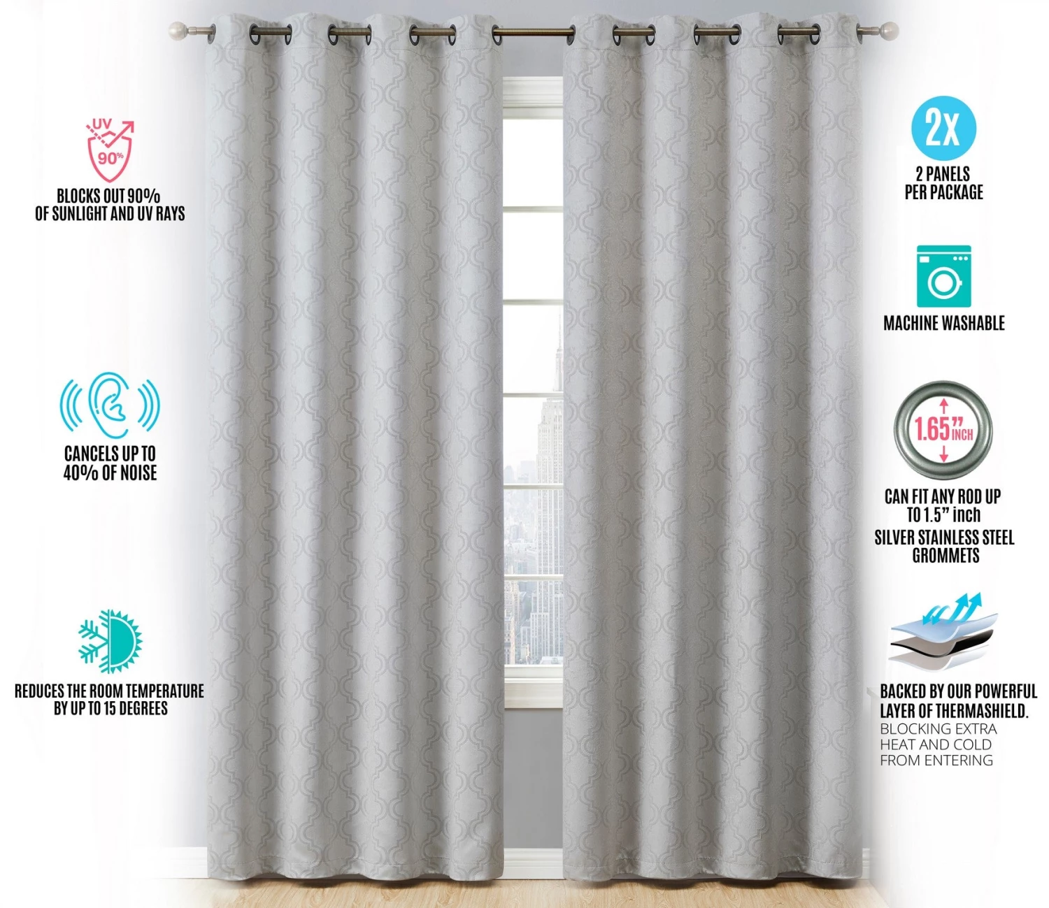 These thermal blackout grommet top curtains are manufactured as a triple weave technology. A triple weave technology is a denser fabric and is tightly sewn together with black yawns to insulate the heat and cold from entering and to achieve its blackout capabilities. The blackout grommet top curtain panel blocks out 90% of light for a great night sleep. Perfect for anyone who is a daytime sleepers who works at night and for any afternoon naps. A great add to a living room, bedroom, childs room, playroom and workplace.