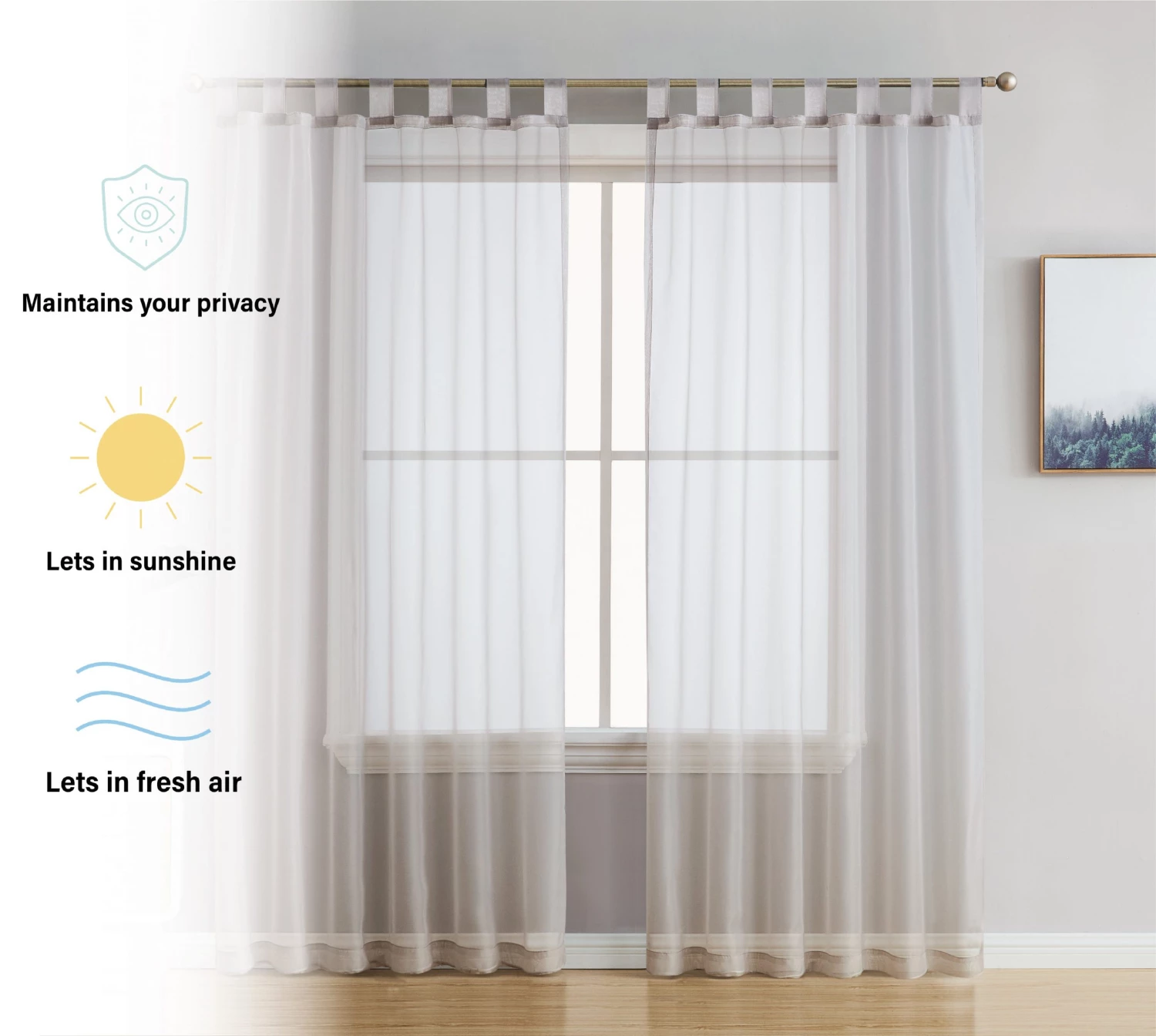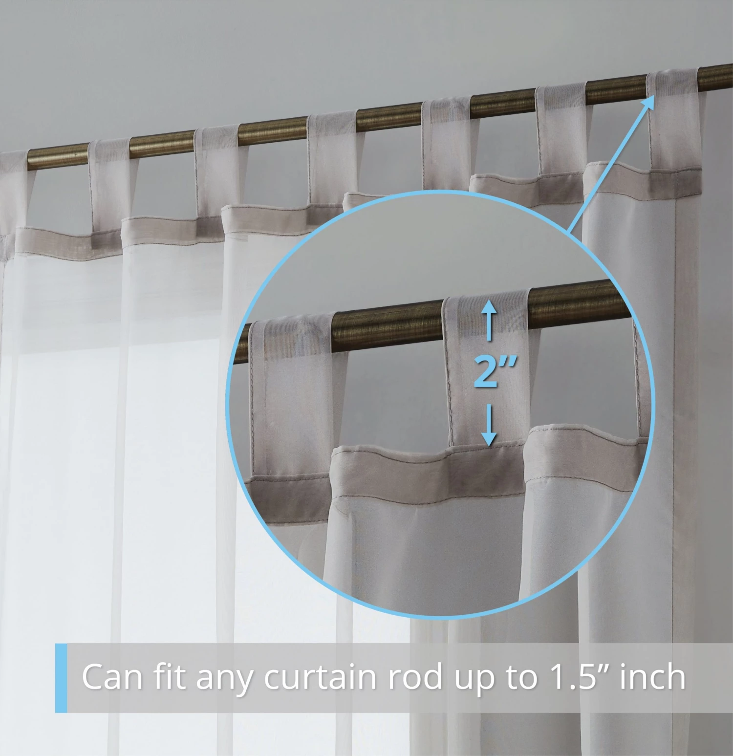 Tab-Top Sheer voile curtains give a light, romantic and airy look to a room by allowing sunlight to pass through the curtains. The fabric of voile curtains makes a unique window treatment that allows you to see outside but still allowing for privacy. For most home owners this is a great feature of sheer voile grommet curtains. Light weight sheer voile curtains are a very effective decorating tool. Because of the lightness to the fabric allow light to enter the room while still providing privacy. They can be used for in many other ways as well. One of the great qualities to sheer voile curtains is they they come in a wide variety of colors and are generally inexpensive. This allows your to use them in every room of the house without breaking your budget. Sheer curtains are very easy to install and make them a great addition to any room as you can create a designer look with little effort. Each curtain panel can fit a curtain rod up to 1. 5 inch. Fiber Content: 100% Polyester. Package contains two (2) voile sheer window curtain panels. Care Instructions: Machine wash cold, Gentle Cycle. Use only non-chlorine. Bleach as needed. Tumble Dry Low. Iron on lowest setting as needed.