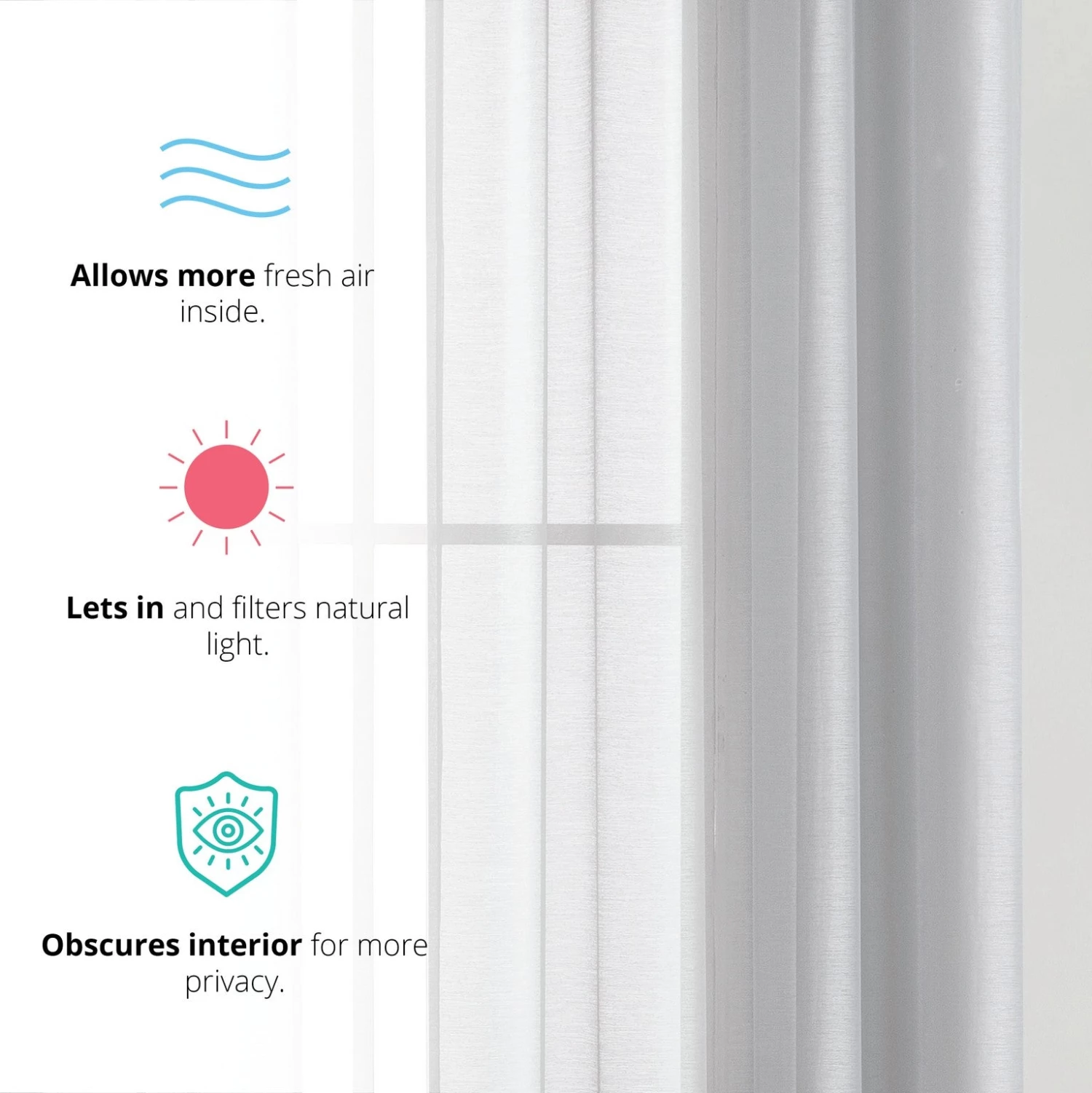 Voile Sheer Curtain Grommet Panels will liven up your indoor or outdoor spaces with a sense of airiness and beauty. Made from solid color polyester voile. Bring elegance and class to any room with this light filtering voile sheer curtains. Our luxurious sheer grommet panels gives your home a new elegant look. Allows natural light to flow through the room. Available in 45″ inches long, 63″ inches long, 72″ inches long, 84″ inches long, 90″ inches long, 95″ inches long, 108″ inches long, and 120″ inches long. For a full look use two (2) panels to cover a standard size window. This picture shows two (2) sheer grommet panels and this package contains two (2) Sheer Grommet Panels.